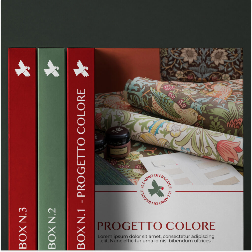 Abbiamo affrontato questa sfida con un approccio più studiato. Il nome dell’attività rimanda a una famosa carta da parati di William Morris dove sono rappresentate illustrazioni di uccelli e fragole. Traendo ispirazione da questo abbiamo affrontato il rebranding, rimanendo fedeli alle necessità della cliente.